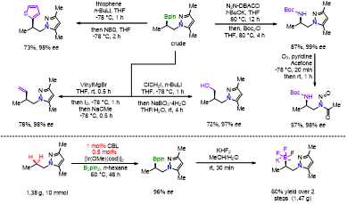 最近,该团队利用三环己基苯基取代的CBL,首次实现了吡唑类化合物氮原子β位亚甲基的C(sp3)-H键硼化反应,产物的最高ee值为99%(图一)。该反应具有非常广谱的底物兼容性,所获得的硼化产物粗品可通过C-B键的立体专一性转化反应实现一系列光学活性的β-官能团化的酰胺类化合物,并能够实现克级反应(图二)。此外,吡唑基团可非常方便地转化为通过臭氧解转化成有用的酰胺类化合物。