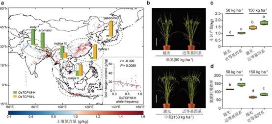 图a-d: OsTCP19-H在低氮和中氮下可显著提高水稻产量; a, OsTCP19-H基因型频率与土壤含氮量呈显著负相关。亚洲不同水稻种植区域土壤含氮量和OsTCP19基因型频率地理分布信息。蓝色和红色图块表示土壤总氮含量(g/kg),黄色和绿色柱形图表示OsTCP19-L和OsTCP19-H基因型频率。6个虚线框分别表示japonica (n = 874)、indica I (n = 205)、indica II (n = 217)、indica III (n = 891)、aromatic (n = 81)和aus (n = 201)地理分布范围。副图表示土壤含氮量和OsTCP19-H频率呈显著负相关。OsTCP19-H频率由1764份籼稻品种以国家为单位计算得到,土壤含氮量收集于相应国家的水稻种植区域。b,越光和含OsTCP19-H基因型近等基因系的田间表现。标尺为24 cm。c-d,越光和近等基因系在低氮和中氮大田条件下的产量和氮肥利用效率。不同字母表示显著性差异(P < 0.05, one-way ANOVA, Tukey’s HSD test)。