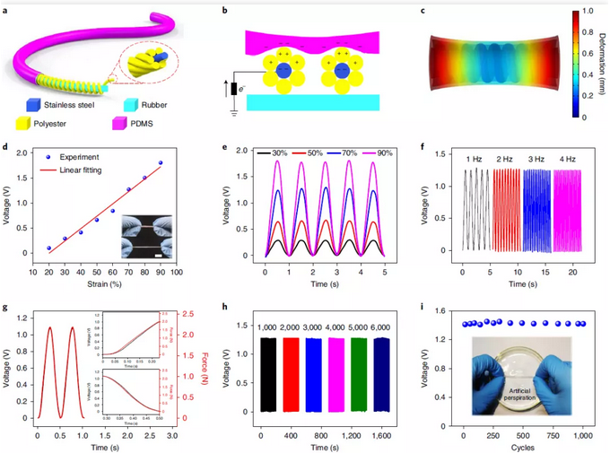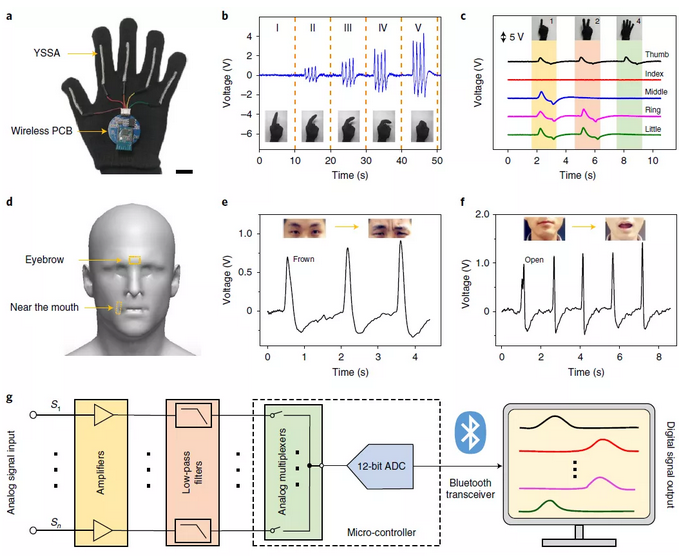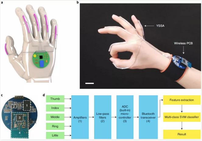 近日,重庆大学光电工程学院杨进教授团队研制了一款柔性无线可穿戴手势翻译系统,该系统由螺旋芯鞘型可拉伸传感阵列和无线电路模块组成;螺旋芯鞘型可拉伸传感阵列最大拉伸应变可达100%,同时具备高灵敏度、快速响应时间以及良好的机械和化学稳定性,可以舒适的贴附在皮肤表面实现关节运动信息和表情变化实时、精确的捕捉;结合无线电路模块与机器学习算法,该系统可以将手语手势直接转换为语音进行输出,系统的识别准确率可达98.63%,平均识别时间< 1s,同时系统的总重量仅为25.8 g,大大提高了手语翻译系统的可穿戴性及实用性。