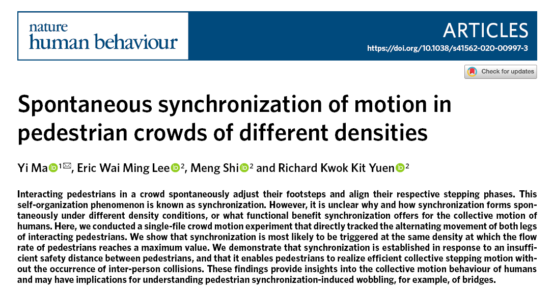近日,我校灾后重建与管理学院马毅副研究员与香港城市大学李伟明副教授、施朦博士、袁国杰教授合作,在行人交通流与应急疏散管理研究方面取得重要进展,相关成果在国际前沿期刊Nature Human Behaviour上以全文形式发表。马毅副研究员为论文的唯一第一作者与唯一通迅作者,四川大学灾后重建与管理学院为唯一第一作者与唯一通迅单位。