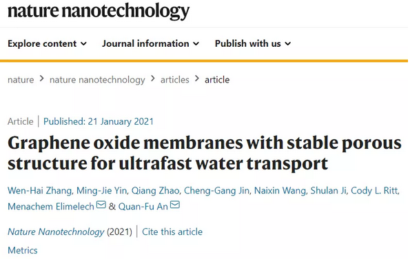 研究表明,水分子在GO分离膜内的传递,主要依靠GO片层间形成的横向二维纳米通道和GO片层边缘间形成的纵向贯通孔道。因此,如何实现对这两种水传质通量的精准调控是获得高性能GO分离膜的关键,然而这又极具挑战。基于此,北京工业大学环境与生命学部安全福教授团队与中国工程院外籍院士、耶鲁大学Menachem Elimelech教授团队合作,在高稳定GO基分离膜结构调控以及水纯化技术领域取得重要研究进展。相关成果以“Graphene Oxide Membranes with Stable Porous Structure for Ultrafast Water Transport”为题在国际顶尖学术期刊《自然·纳米技术》(Nature Nanotechnology)上发表,论文链接:https://doi.org/10.1038/s41565-020-00833-9。北京工业大学环境与生命学部2017级博士生张文海为论文的第一作者。
