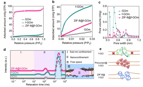 图2:ZIF-8选择性生长机制研究。(a) GOm, f-GOm和ZIF-8@f-GOm氮气吸附等温线。(b-c) GOm, f-GOm和ZIF-8@f-GOm二氧化碳吸附等温线及其孔径分布。(d) GO基分离膜甲醇探测条件下的横向弛豫时间分布谱图。(e) ZIF-8选择性生长机制示意图。