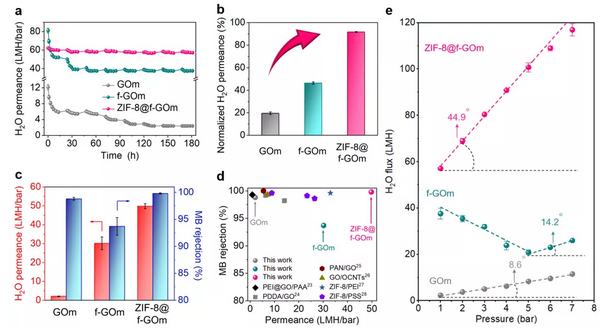 图3:GO基分离膜错流条件下纳滤性能。(a-b) GO基分离膜错流长期操作纯水通量稳定性实验以及稳态纯水通量归一化性能。(c) GO基分离膜水渗透性和甲基蓝截留性能。(d) GO基分离膜水渗透性和甲基蓝截留性能与文献报道数据性能对比。(e) GO基分离膜错流长期操作纯水通量的压力依赖关系。