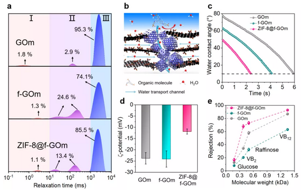 图4:ZIF-8@f-GO杂化膜分离机理研究。(a) GO基分离膜在水分子探测条件下的横向弛豫时间分布谱图。(b) ZIF-8@f-GOm分离膜内水水传质通道以及分离机理示意图。(c) GO基分离膜动态接触角。(d) GO基分离膜表面Zeta电位。(d) GO基分离膜中性分子截留性能。