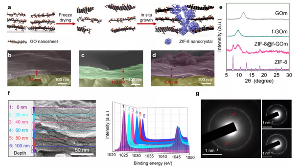 图1:ZIF-8@f-GO杂化膜的制备与表征。(a) ZIF-8@f-GO杂化膜制备示意图。(b-d) GOm, f-GOm和ZIF-8@f-GOm断面扫描电镜图片。(e) GOm, f-GOm, ZIF-8@f-GOm 和ZIF-8的XRD图谱。(f) ZIF-8@f-GOm内不同深度Zn元素分布。(g) GOm, f-GOm和ZIF-8@f-GOm电子衍射图谱。