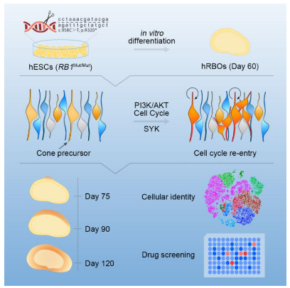 本研究中,研究人员将人类胚胎干细胞分别进行RB1基因的靶向高频突变(RB1Mut/Mut)及敲除(RB1-/-)之后,发现多能性及细胞周期等均未变化。通过体外分化诱导技术使其发育成为视网膜类器官(Retinal Organoids)。在定向分化第60天前后出现了明显的瘤体形成。此类瘤体细胞在基因表达谱、分子信号通路、甲基化谱、标记蛋白及超微结构等方面表现出高度一致的视网膜母细胞瘤特征,且将其移植到动物眼内后可成瘤。单细胞RNA测序等分析显示,此肿瘤起源于正在成熟的视锥前驱细胞(maturing cone precursor),同时表达ARR3和Ki67(正常情况下ARR3+视锥前驱细胞不再表达Ki67)。随后,研究者基于其显著激活的PI3K-Akt信号通路特征,通过靶向该通路的激动剂SYK,成功筛选到两个候选新药分子。