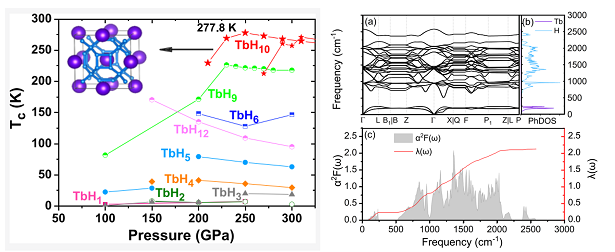 图:TbH10-Fm3m晶体结构及Tb-H化合物超导转变温度(左)和TbH10-Fm3m声子谱、声子态密度、 Eliashberg 谱函数α2F (ω)和电声耦合强度积分(右)