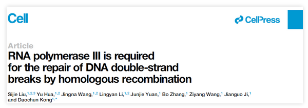 2021 年 2 月 23 日,北京大学生命科学学院孔道春实验室在Cell在线发表了题为RNA polymerase III is required for the repair of DNA double-strand breaks by homologous recombination 的研究论文。该研究发现了DNA同源重组过程的一个必需中间体—RNA-DNA hybrid,及一个必需因子—RNA 聚合酶III,解决了真核细胞DNA同源重组领域里一个长期悬而未决的核心问题,并推动DNA同源重组事件分子机制的理解到一个新的层次。