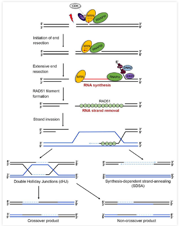 DNA同源重组由三大主要步骤组成(图2):1)链末端切除 (end resection):MRN-CtIP、DNA2、EXO1等核酸酶对DNA双链断裂(DNA double-strand break, DSB)处进行5’-链降解,切除大约几千个核苷酸,导致3’-单链DNA形成;2)3’-单链DNA入侵同源DNA模板链(strand invasion):通过多个蛋白帮助,Rad51包裹 3’-单链DNA形成核酸-蛋白复合体,该复合体侵入同源DNA链, 3’-单链DNA作为引物进行DNA合成;3) 解开Holliday Junction(HJ)结构(resolution of Holliday Junction):3’-单链 DNA 侵入同源DNA模板链后,随后进行的DNA合成及链交换反应,导致HJ结构形成,相关核酸酶解开HJ结构,并最终完成DNA同源重组过程。