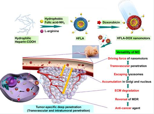 针对肿瘤化疗过程中药物渗透性差和产生多药耐药的两大挑战,沈健、毛春教授课题组设计了具有运动能力和一氧化氮(NO)缓释的阿霉素/叶酸/L-精氨酸(HFLA-DOX)纳米机器人,能够实现肿瘤化疗中药物的深层穿透和多药耐药的有效逆转。并相应地提出了一种新的化疗模式,即识别-渗透-逆转-消除,他们通过体外细胞实验和体内动物肿瘤模型验证了其有效性。该工作与南京大学医学院附属鼓楼医院的魏嘉教授团队合作完成。