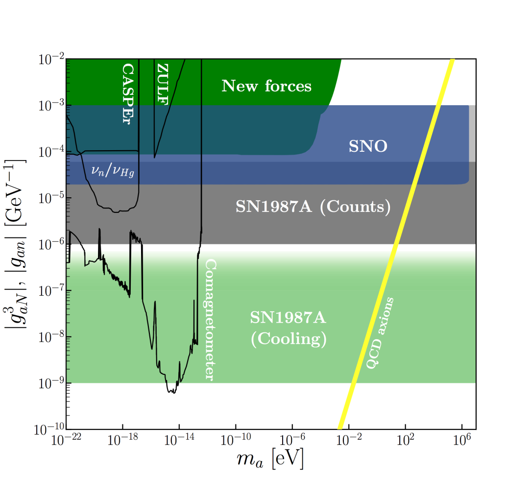 的参数空间(如下图蓝色区域), 并在部分参数空间给出了目前世界上最强的实验限制,这也是世界上首次对此耦合常数给出直接探测的实验限制。如果该耦合常数中轴子质子耦合常数与轴子中子耦合常数没有精确相消,该结果能够排除以前实验如SN1987A 和 Neutron Star Cooling 等没有排除的相关参数空间。具体如下图所示: