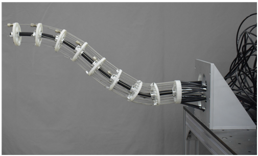 中国科学院宁波材料技术与工程研究所精密驱动与机器人团队利用了绳索的高效力传导以及具有本质柔性的特点,研发了具有多个关节模块的绳索驱动连续体机器人臂,绳驱动机器人臂采用多根轻质绳索协同驱动,与传统主动关节驱动的机器人臂不同,绳驱动机器人臂是由被动关节支撑,主动绳索驱动,由于主动绳索的驱动装置全都安装在机座上,因此绳驱动机器人臂具有自重轻、转动惯量小和易于实现变刚度控制等优点,既能够产生本质安全的运动,也能达到较高的载重-自重比。