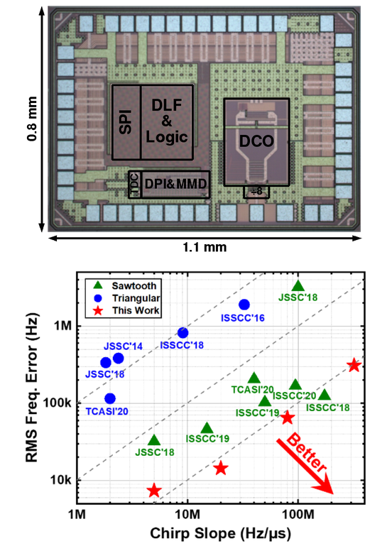 基于上述创新技术,课题组研制出一款面向毫米波调频雷达应用的24GHz调频连续波频率综合器芯片,该频率综合器采用全数字架构,辅以先进的自适应校准算法,刷新了当前同波段下调频带宽(3.2GHz@24GHz)和调频速率(320MHz/μs)的世界纪录,且调频过程中最小频率均方根误差仅7.35kHz,也是同类最优水平。