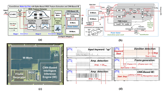 图1. (a)异步事件驱动型AIoT芯片架构,(b)卷积神经网络电路架构,(c)芯片显微照片,(d)语音关键词唤醒测试波形