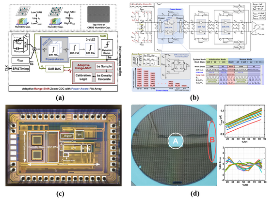 图2. (a)动态电荷域电容传感芯片架构图, (b)电路原理图及工作时序图, (c)芯片显微照片,(d)晶圆不同位置处的芯片、湿度及其误差测试曲线