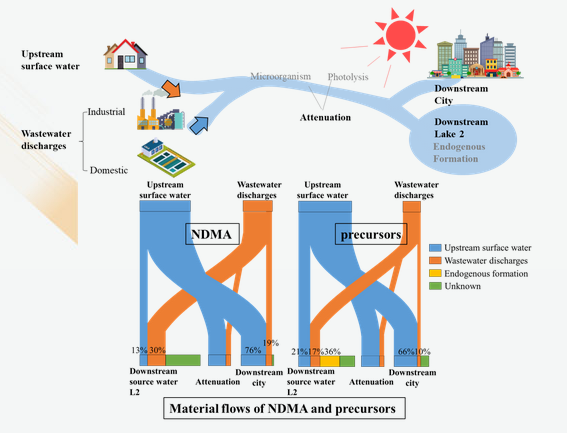 研究结果表明,上游地表径流向位于该城市下游的某水源地汇入了13±4%的NDMA和21±3%的NDMA前体物;该城市的生活污水和工业废水排放向下游水源地汇入了30±8%的NDMA和17±2%的NDMA前体物;水源地自身的微生物代谢最多可贡献36%的NDMA前体物。因此,上游地表水汇入和当地污废水排放是下游水源地中重要的NDMA来源;上游地表水汇入、当地污废水排放和水源地自身的微生物代谢是重要的NDMA前体物来源;自然衰减机制仅去除了部分径流机制带来的污染物负荷。研究表明,不仅要关注供水系统内作为新型消毒副产物的亚硝胺类生成,也要关注水环境中作为新型污染物的亚硝胺排放。本研究工作为全面、系统认识饮用水亚硝胺风险的来源,制订针对性的控制策略提供了重要的技术思路。