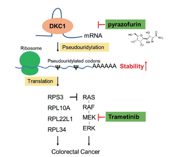 DKC1属于假尿嘧啶合成酶家族,催化RNA发生假尿嘧啶(ψ)修饰。DKC1同时也是端粒酶复合物的亚基,其基因突变会导致先天性角化不良,但其在肿瘤治疗中的潜在价值目前尚未知晓。研究团队发现DKC1的表达水平在结直肠癌组织中异常升高,且其高表达与患者的不良预后显著相关。功能研究表明,DKC1能够结合包括RPS3在内的多个核糖体蛋白的mRNA,延长这些mRNA的半衰期,从而升高RPS3等蛋白在细胞内的表达量,促进肿瘤细胞的恶性增殖。相反,DKC1的抑制剂pyrazofurin则显著抑制RPS3等核糖体蛋白的表达,具有抗肿瘤活性。这些研究表明DKC1是一个结直肠癌治疗的候选新靶标。