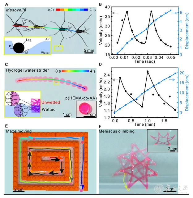 研究团队探索发现其运动机理和自然界的水黾在水面的运动存在共通之处,都通过表面张力的差异驱动自身在水面运动(如图1A和1C所示),并且运动速率的变化规律也非常一致(如图1B和1D所示)。通过设计活性水凝胶材料的形状、材料分布的非对称性和周边环境的表面亲疏水性,研究团队控制该活性水凝胶材料进行各种可控轨迹和定向的运动,例如模拟球类运动和走出迷宫运动(图1E)等。