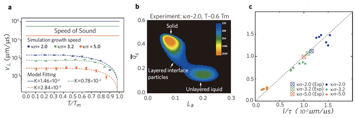 a.带电胶体粒子的晶体可在低温下快速生长,且生长速率对温度不敏感;b.在晶体生长过程中,先在晶体表面形成具有层状结构的界面层,然后再生成晶体,图中Q6是表征晶体结构的序参量,La是表征层状结构好坏的序参量;c.在极低温下,界面层厚度l与单粒子由液体到晶体的平均转化时间τ主要由粒子间相互作用决定,用无扩撒模型l/τ预测的生长速率与实际观测结果吻合