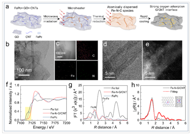 面对上述问题,他们通过微波合成法超快制备Fe-N-G/CNT单原子催化剂,实验结果结合理论计算证明了不同纳米碳界面之间的电荷分离现象及亲氧界面的存在,并阐明了其在贫氧环境下实现高效氧还原催化的机理。将其应用于海水电池,在0.4 mg·L-1的超低氧含量下,采用Fe-N-G/CNT催化正极的海水电池仍然可以正常工作而传统Pt/C催化剂则无响应,证明了亲氧催化剂在极端环境中的关键作用。