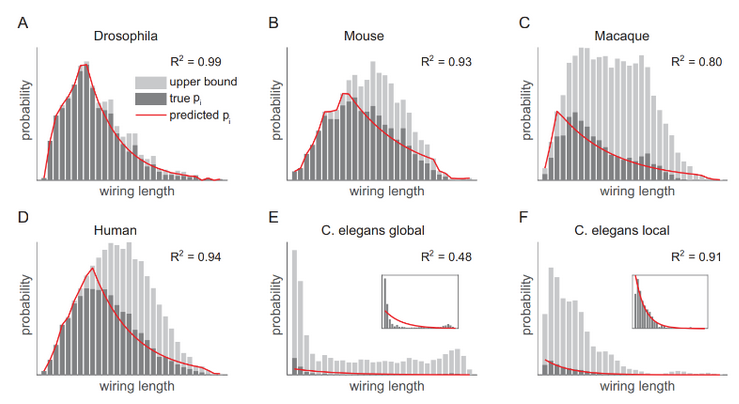 针对以上问题,课题组首先通过分析发现,从线虫、果蝇到小鼠、猕猴和人类这五个物种的脑网络连接边的长度分布均符合在几何空间约束和生物材料约束前提下的最大熵原理。随后课题组进一步提出蕴含最大熵原理的生物学实现过程以及相应的脑网络结构生成模型,数值实验表明模型可较为准确地重构五个物种脑网络结构的多种统计特性。最后,课题组通过分析表明大脑网络的最大熵对应于网络较小的平均最短路径等结构特点,从而支持其高效的信息处理功能。