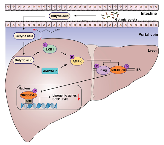 肠道菌群产生的丁酸通过门脉进入肝脏,激活LKB1-AMPK-Insig通路,抑制SREBP-1c的转录活性,从而下调脂质合成基因的表达,降低肝细胞脂质沉积水平,改善脂肪肝。靶向LKB1及Insig激动剂可为非酒精性脂肪性肝病的治疗提供新的思路和策略。