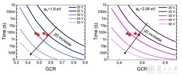 图2.存储器中电子与空穴编程速度与栅耦合比、电场的定量关系图