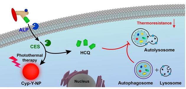 传统的肿瘤光热治疗温度通常高于50 oC,可能会导致健康组织受损、肿瘤的转移和复发等副作用。肿瘤温和光热治疗(温度低于45 oC)可以有效避免以上的副作用。酶诱导自组装可在病灶部位浓聚和释放药物,在癌症诊疗方面已显示出独特的优势。然而,基于酶诱导原位自组装实现肿瘤温和光热治疗疗效增强的策略尚未见报道。梁高林教授课题组合理设计出一种对碱性磷酸酶和酯酶双响应的分子前药。该前药在癌细胞内酶的诱导下自组装形成光热纳米颗粒,同时释放羟基氯喹。在癌细胞接受温和光热治疗的同时其自噬被抑制,从而显著提高恶性肿瘤的光热治疗疗效(见下图)。与吴富根教授课题组的合作动物实验结果表明,这种酶触发的细胞内光热纳米粒子形成和自噬抑制的策略显著提高了裸鼠模型肿瘤的温和光热治疗效果。这种“智能”策略可启发人们设计新型前药分子用于癌症的协同治疗,在疗效增强的同时提高治疗的安全性。