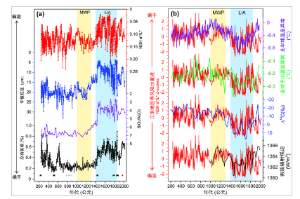 江淮地区季风降水的长期演变规律和驱动机制一直是备受古气候学界关注的科学问题,但由于受自然条件和人类活动等因素影响,江淮地区缺少定年精准且高分辨率的季风降水重建材料。针对这一科学问题,研究团队对女山湖沉积物进行细致分析,构建了精准的年代学框架,进而运用多种水文代用指标进行对比分析和相互验证,成功重建了江淮地区过去1800年高分辨率季风降水演变记录,发现小冰期(公元1400-1850年)降水相对于中世纪暖期(公元1000-1300年)明显增多,过去千年降水变化呈现“暖干-冷湿”模态(图1a),与华北地区降水变化趋势相反。