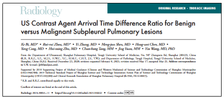 北京时间7月21日晨,Radiology(《放射学》)杂志在线发表了我校附属上海市肺科医院超声科王茵教授团队原创的“超声造影剂到达时差比鉴别诊断胸膜下肺部良恶性病灶(US Contrast Agent Arrival Time Difference Ratio for Benign versus Malignant Subpleural Pulmonary Lesions)”一文。
