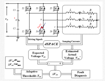 目前国际上已有的一些工作中,故障检测和定位的速度仍有待提高,对参数误差和传统经验阈值的依赖还没有完全解决。在该项研究中,尹浩然同学在导师陈勇教授的指导下,提出了一种在不增加额外硬件的情况下提高速度和鲁棒性的快速故障诊断算法,即基于电压模型的快速实时开路故障定位方法。首先,对于每个开关周期,通过期望电压和实际电压计算得出各相的电压偏差,其中期望电压和实际电压分别通过混合逻辑动态模型和测量电流所获得。然后,将各相的电压偏差用作故障变量。通过这种方式,避免了使用额外的硬件,并且易于嵌入系统中。此外,考虑到采样误差、参数误差、死区时间、延迟时间和过渡时间的影响,设计自适应阈值。该方法定位到具体故障开关管的时间仅为几个开关周期。提高了动力系统中电压源逆变器的故障动态实时在线检测性能。