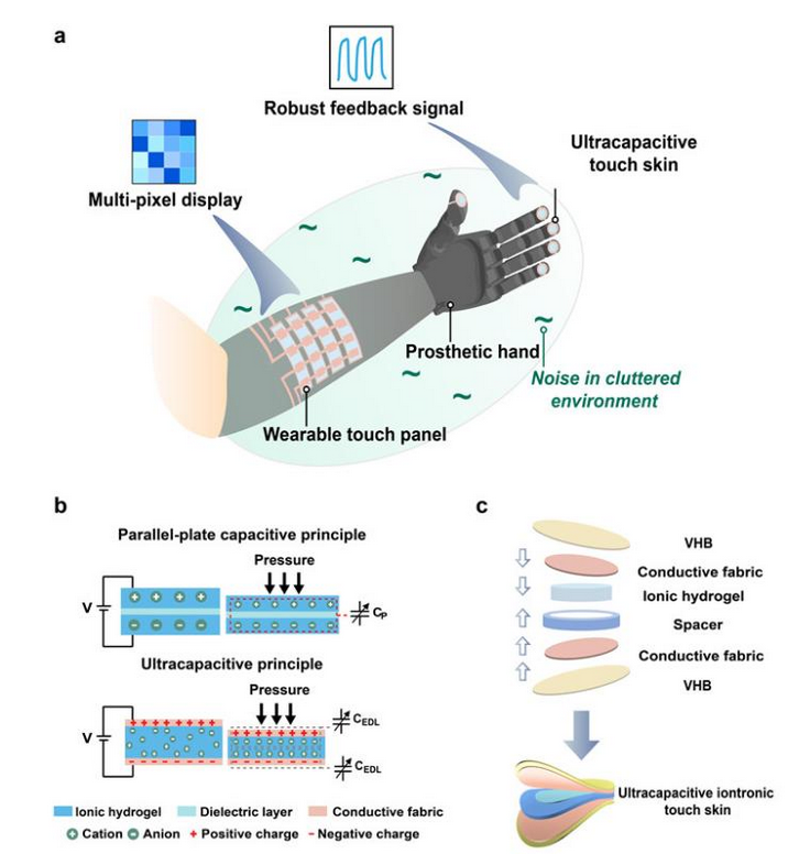近日,上海交大机械与动力工程学院机器人研究所朱向阳教授、谷国迎教授团队联合美国卡耐基梅隆大学的Carmel Majidi教授在Advanced Materials期刊上提出了一种高灵敏的柔性离子凝胶压感皮肤,利用超高电容机理,实现了超宽的压力检测范围、快速响应时间、高电容基线(nF-μF级)和高信噪比,在生理信号监测、多点传感阵列、残疾人软体假肢手触觉反馈等领域取得了实际应用。论文“Cutaneous Ionogel Mechanoreceptors for Soft Machines, Physiological Sensing, and Amputee Prostheses” 第一作者是机器人研究所博士研究生沈泽群。