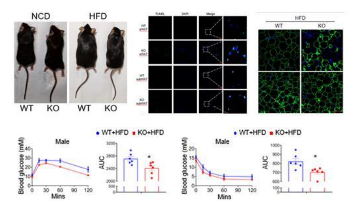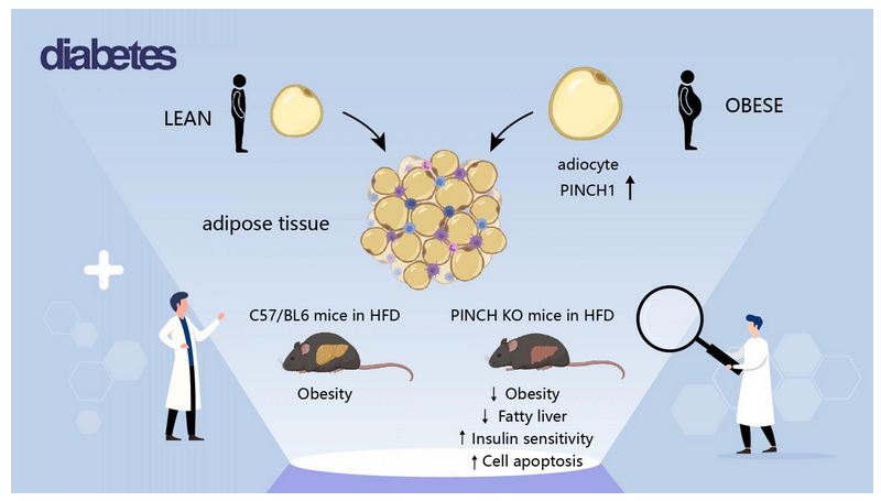 研究团队发现,在肥胖小鼠和肥胖症患者的脂肪组织中Pinch蛋白的表达较高。在正常饮食状态下,脂肪细胞敲除Pinch基因后并没有观察到健康小鼠明显代谢改变,但下调Pinch表达可有效缓解由高脂饮食造成的肥胖小鼠脂肪异常积累及胰岛素抵抗。研究还发现,Pinch基因敲除会促进肥胖小鼠脂肪细胞凋亡,而敲除脂肪细胞中凋亡相关蛋白分子Caspase8后,则可以有效逆转Pinch基因敲除所造成的体重减轻,胰岛素抵抗缓解等。因此Pinch蛋白可能作为预防和治疗肥胖及II型糖尿病的新靶点。