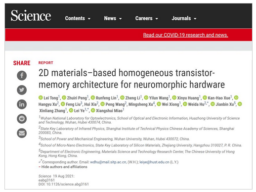 8月19日,《科学》(Science)在线发表了华中科技大学光电信息学院/武汉光电国家研究中心缪向水、叶镭团队题为“2D materials-based homogeneous transistor-memory architecture for neuromorphic hardware”的研究论文。