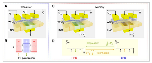 论文中单个器件包含多层二硒化钨(WSe2)沟道、周期性极化的铌酸锂(LNO)介质、发射极(E)、集电极(C)、基极(B)和基极下的栅极(G)。E、C、B电极下的LNO介质分别具有向上、向下、向上(Pu-Pd-Pu)的极化分布,对WSe2构成N-P-N掺杂。当G接地,该器件具有BJT功能。将多个BJT连接用于构建运算放大器,可以实现模拟信号的放大、加法运算、积分运算、电压比较等功能。当E、B接地,通过栅压改变基区下方LNO的极化方向,Pu-Pd-Pu和Pu-Pu-Pu极化分布分别为高阻态和低阻态,实现非易失存储功能。