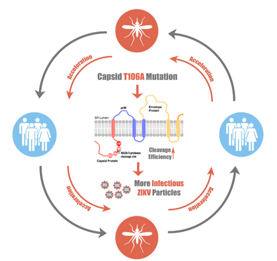 图1:衣壳蛋白T106A突变促进寨卡病毒感染与传播机制示意图