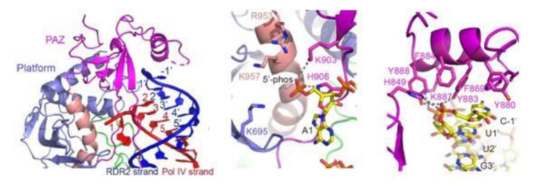 前体小RNA末端被DCL3识别后,剩余部分在被DCL3多个结构域形成的一个结合通道所包裹。DCL3沿着RNA对RNA产生了多个位点的识别,延伸至其两个RNaseIII结构域时则并排形成二聚体的形式,同时对前体小RNA的两条链产生切割,这样恰好一个RNaseIII切在前导链第24和25碱基间产生24-nt的产物,而另一个RNaseIII切割在互补链第23和24碱基间产生23-nt的产物。解析了Dicer家族内切酶对小RNA的长度测量机制。因其下游的AGO4偏好识别24-nt 小RNA,所以同时也解释了小RNA的链选择性机制问题。后续的生化和体内小RNA测序实验验证了末端识别和特异性切割对DCL3产生特性长度小RNA的重要性。