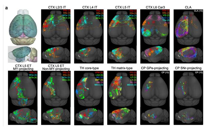 文章报道了目前全世界最大的1741鼠脑神经元数据集,包含来自皮层,屏状核,纹状体和丘脑等脑区神经元。本文鉴定了:11种主要的投射神经元类型,它们具有不同的形态学特征和相应的转录组特征;主要类型内部发现了丰富的神经元投射类型,可以聚类成更精细的子类型。神经元的多样性符合多水平调控长程投射的规则,包括分子水平、发散或收敛投射模式、轴突末端模式、脑区特异性、拓扑结构和单细胞差异性。
