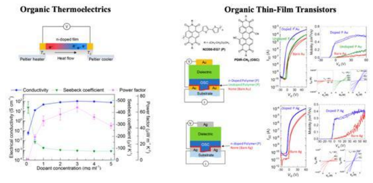 图3.n-型有机半导体的催化掺杂技术实现了包括有机热电器件(Organic Thermoelectrics)和有机薄膜晶体管(Organic Thin-Film Transistors)在内的多种有机电子器件性能的大幅度提升。