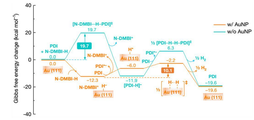 图2.分子掺杂剂N-DMBI-H掺杂机理的DFT计算结果,青色和橙色分别对应无催化剂和有催化剂的掺杂过程的吉布斯自由能变。