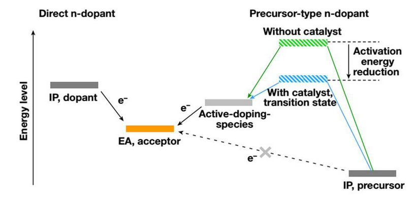 图1.基于过渡金属催化的n-型分子掺杂概念。蓝色线条代表过渡金属催化掺杂路径,催化剂的引入大幅度降低了反应能量势垒,从而掺杂效率可以实现数量级的提升。
