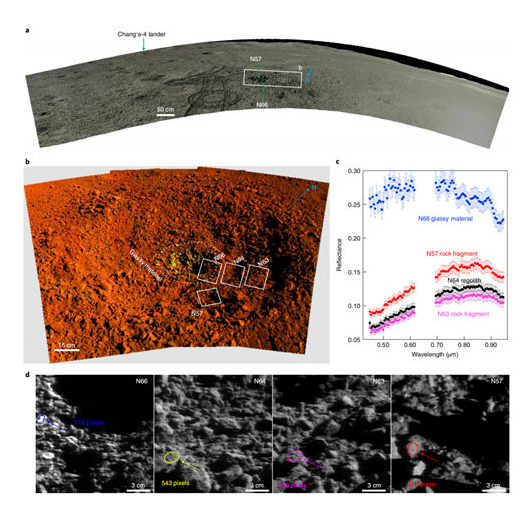 图1. 玉兔2号对巡视路径上“偶遇”的一个小型新鲜撞击坑进行详细的光谱探测。(a) 由玉兔2号上搭载的全景相机获取的影像拼接而成的全景图,可以看到撞击坑与着陆器的相对位置;(b) 全景相机近距离拍摄的小撞击坑全貌,该图为假彩色图。撞击坑中心呈现的黄绿色部分为可能的撞击体残留物。白框指示的是进行了成像光谱观测的区域;(c) 从成像光谱观测区域中提取的典型“残留物”、月壤、岩石碎块的反射光谱;(d) 成像光谱仪获取的观测区域影像。(Yang et al., 2021 Nature Astronomy)