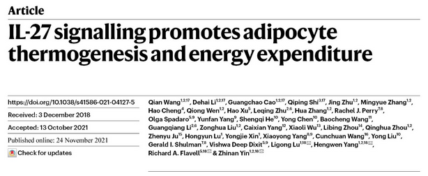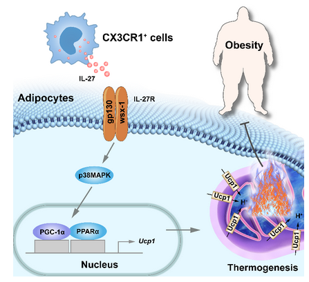 在这一工作中,研究人员通过构建多种基因工程小鼠,进行高脂饮食诱导的肥胖模型,并结合肥胖人群样本发现:肥胖人群血清中白细胞介素27(IL-27)水平下降;突破了传统观念中白细胞介素IL-27专一性靶向免疫细胞的认知,首次发现IL-27通过直接作用于脂肪细胞,导致白色脂肪细胞棕色化,并激活UCP1介导的“脂肪燃烧”;通过将脂肪组织中的脂质转变为热量消耗掉,从而达到降低体重和改善糖尿病等代谢性疾病的目的。这是首次发现IL-12细胞因子家族中的IL-27能直接作用于脂肪细胞,并且导致脂肪细胞分化及产热,为治疗肥胖及代谢性疾病提供了新的靶点。动物实验中,注射重组IL-27可以显著减轻肥胖小鼠的体重并改善胰岛素信号敏感性,初步验证了IL-27作为治疗药物的潜力。