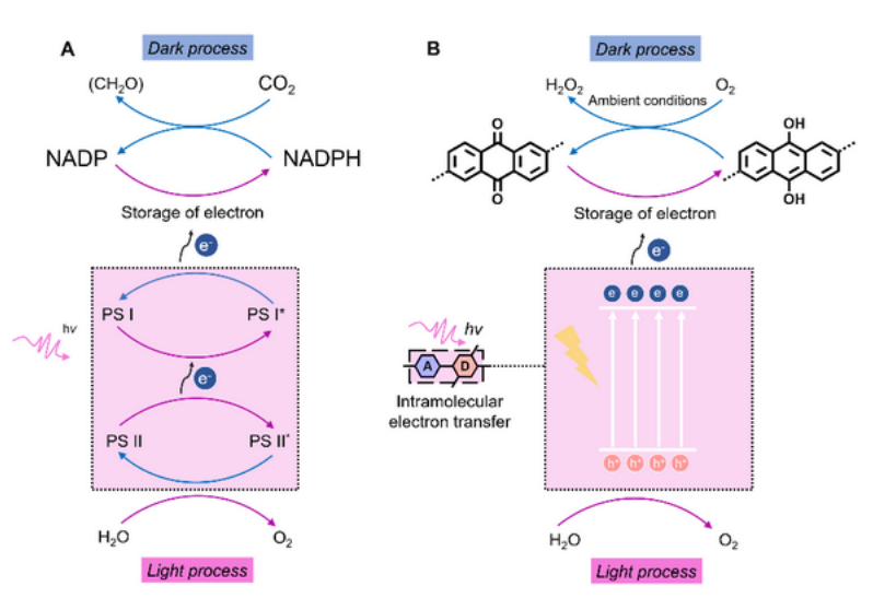 图1(A)绿色植物的电子转移和储存策略;(B)仿照绿色植物光合作用所发展的电子转移和储存策略