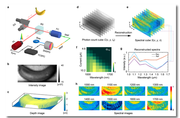 南京大学吴培亨院士团队首次在两者的结合上取得突破,他们利用超导纳米线单光子探测器固有的非线性光谱调制特性,结合计算光谱仪方法,实现了单探测器光谱仪(single-detector spectrometer, SDS)。这是一种最简化的光谱仪,摆脱了对光学分光器件的需求,通过编程探测器测量过程并结合计算重构算法,就能够对入射光谱进行分辨。实验演示了从660nm至1900nm的宽带测量能力,并在通信波段实现了优于10nm的光谱分辨率。同时,该团队还将激光雷达同单探测器光谱仪结合,演示了多光谱激光雷达功能。