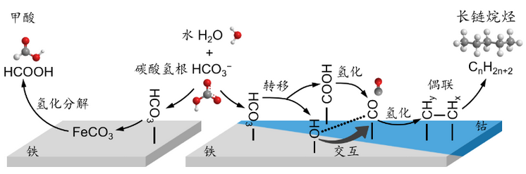 研究发现,碳酸氢根不仅充当碳源,还促进钴氧化物的还原,原位生成高活性的钴纳米片催化中心,突破了化工领域钴遇水即失活这一长期难解决的瓶颈问题。利用新开发的高温高压水热原位红外观察表明,零价钴的存在促进铁表面羟基物种的生成,二者的协同作用增强反应中间体一氧化碳的吸附,有利于其进一步氢化偶联,生成长链烷烃。