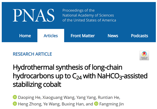 近日,上海交通大学环境科学与工程学院教授金放鸣研究团队在全球顶级综合性学术期刊之一《美国科学院院刊》(Proceedings of the National Academy of Sciences of the United States of America)在线发表了题为“Hydrothermal synthesis of long-chain hydrocarbons up to C24 with NaHCO3-assisted stabilizing cobalt”的论文,首次报道了通过模拟地壳高温高压水热环境,利用铁钴金属将碳酸氢钠还原为长链烷烃,并被选为亮点文章作重要评述。上海交通大学为第一完成和通讯单位,合作单位和作者包括中国科学院化学研究所院士韩布兴与厦门大学教授王野。