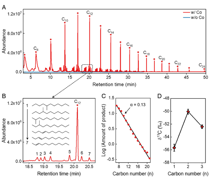 面对这一重大科学问题,金放鸣研究团队通过模拟地球蛇纹石铁钴矿的组成和水热环境,以一般铁粉为还原剂,钴粉为催化剂,在300度和300个大气压下,成功地将碳酸氢钠水热还原为链长达二十四碳的烷烃及烯烃。