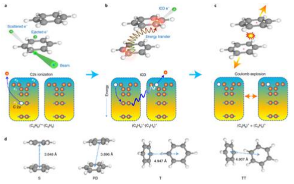 图1 a-c,电子束诱导苯二聚体分子间库仑衰变过程