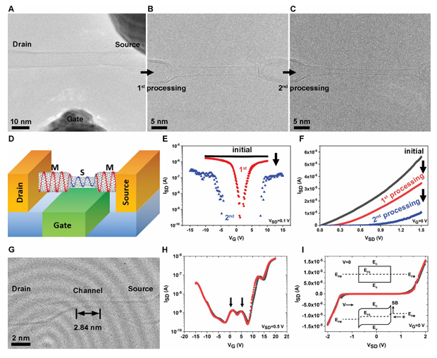 图1 (A-D)单根碳纳米管的原位加工过程。(E-F)碳纳米管电学性质从金属性到半导体性的转变。(G)沟道长度仅为2.8纳米的碳纳米管分子结晶体管,及(H-I)该晶体管的转移特性和输出特性曲线。